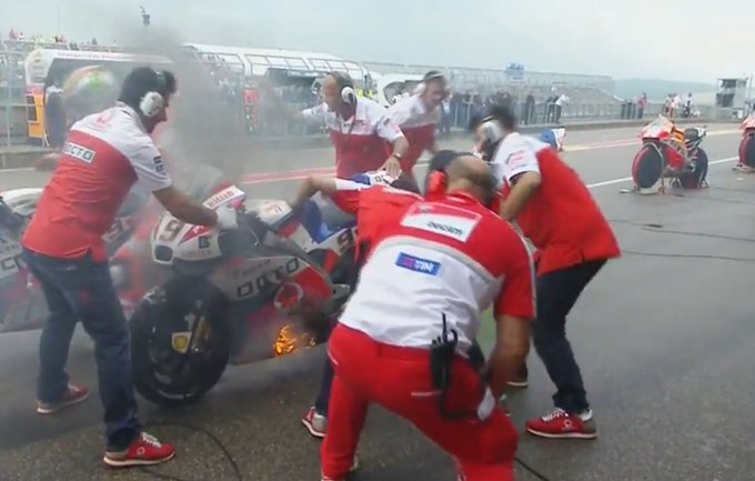 Petrucci's bike is on fire as he returns to pits for spare machine#GermanGP #MotoGP @Petrux9 @PramacRacing